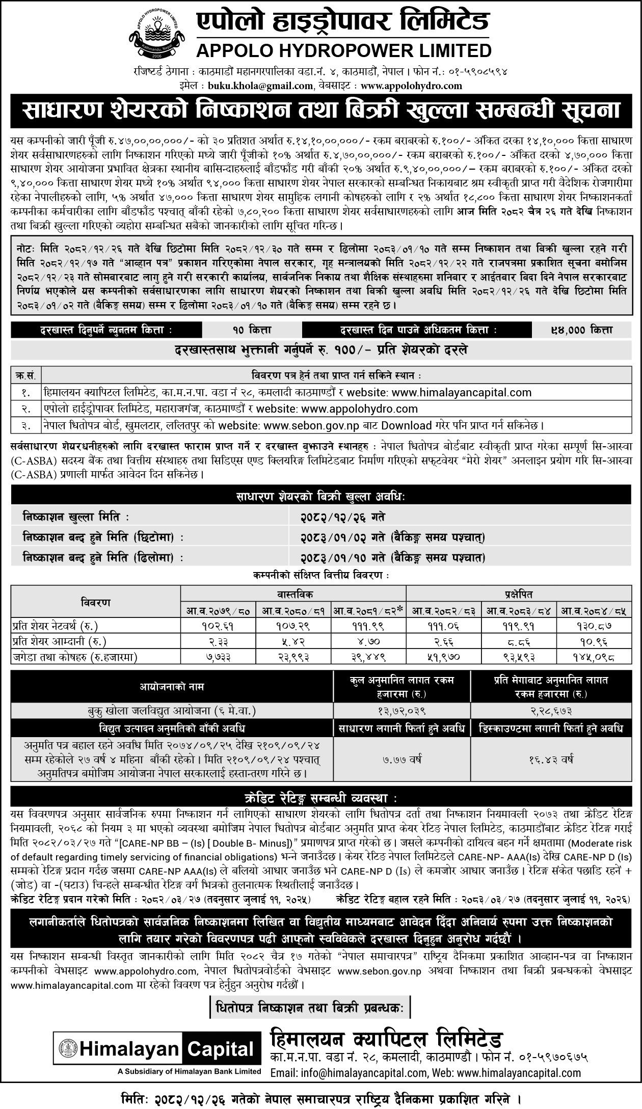 Following in the proud legacy of Himalayan Bank Limited which has stood as the leading financial institution of Nepal since its inception in 1993, Himalayan Capital Limited has been established to provide financial solutions in the same vein, carrying forward the promise of reliable and sustainable growth for its customers with regards to the ever growing financial and capital markets of Nepal.